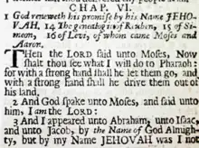 - William Tyndale, in his 1530 translation of the first five books of the English Bible, at Exodus 6:3 renders the divine name as Iehovah. In his foreword to this edition he wrote: "Iehovah is God's name... Moreover, as oft as thou seeist LORD in great letters (except there be any error in the printing) it is in Hebrew Iehovah."
