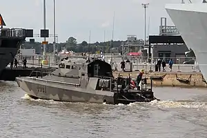 For combat operations, the Jehu-class boats are armed with a Saab Trackfire Remote Weapon Station fitted with either 12.7 mm NSV machine gun or a 40 mm Heckler & Koch GMG grenade machine gun, and a coaxial 7.62 mm PKM machine gun.[3] In addition, the boats have pedestals for two crew-operated NSV machine guns. In future, the modular construction allows fitting of naval mine rails or a light anti-ship missile system.[1]