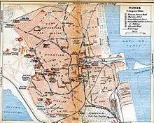 The Jellaz cemetery was of great religious and cultural significance to Tunisians. It was named after Sheikh Abu Abdallah Muhammad Taj ad-Din al-Jallaz (d.1205) who had acquired the land and endowed it as a religious trust, or habous (Arabic: حبوس) (known in many other countries as a waqf (Arabic: وقف)). On the cemetery hill stood the first zawiya founded by the medieval Moroccan sufi Abul Hasan ash-Shadhili, and in 1911 this was the spiritual base for some 5,000 men in Tunis who were members of the Shadhili sufi order he founded.[6] Another zawiya, of Sidi Al Bashir, also stood in the cemetery, and many of the most illustrious families of Tunis had their dead relatives buried there.[2] Under Islamic law, habous property was donated by a benefactor and held in trust for some public benefit;[7] once in trust it could not be bought or sold.[8] However a series of colonial laws since the 1880s had allowed the French in Tunisia to acquire the title or use of growing amounts of habous land.[9][10] Thus land endowed for the benefit of local communities steadily came under the private control of French landlords[5] and in some instances Tunisians occupying or working the land were displaced.[11]