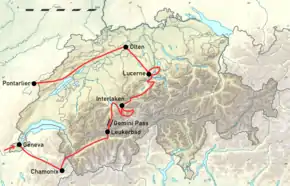 The United Alpine Club began their journey to Switzerland on the morning of 26 June 1863.[1] They first travelled from London to Newhaven by train. In her journal, Morrell observed concerning Newhaven that there was "not a drearier port anywhere". From Newhaven, they took a boat to Dieppe in Normandy from where they then travelled to Paris.[7] From Paris, they travelled to Geneva in Switzerland.[4] When they were leaving Geneva, Morrell records that she and her companions were so eager that they were "downstairs before the servants" and despite constant rain began walking "at the rate of four miles an hour".[4] Morrell and the other women on the trip continuously wore corsets and crinoline dresses though they do not appear to have impended them, even when they went mountain climbing.[10] They awoke at four in the morning every day and were determined to get as much out of the trip as possible; some days the party walked for more than 17 miles (27 kilometres).[4][11] In her journal she recorded how they at times walked along slippery ledges, safeguarded only by ropes fastened to rocks. According to Morrell, the toughest portion of the journey was walking up the Gemmi Pass but the party still had enough energy by the time they reached the top to engage in a snowball fight. Morrell noted that the women used their umbrellas to fend of snowballs thrown at them.[4] Despite the often perilous journey, Morrell noted that "the dangers of Alpine travel may be divided into two classes, the real and the imaginary, and in the retrospect, it was found that ours all belonged to the latter."[12]