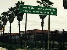 In August 2012, in recognition of Oropeza's work to find the necessary funds to finance completion of a critical section of the Alameda Corridor project that had run out of money, the California Legislature approved the naming of the Honorable Jenny Oropeza Memorial Overcrossing for the section of Pacific Coast Highway in Wilmington that created the bridge that spans the Alameda Corridor. Oropeza successfully worked with Federal, State and local government entities, as well as the railroads and Metropolitan Transportation Authority to find the funds to construct this last and critical portion of the project.
