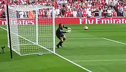 The highlight of Lehmann's international career came in the quarterfinal match (30 June 2006, Olympiastadion, Berlin) against Argentina. The game remained tied 1–1 after 90 minutes and extra time. The game came down to penalty kicks and Lehmann carried his team through, picking the right direction for all spot kicks, making saves from Argentinians Roberto Ayala and Esteban Cambiasso and almost saving a third. Meanwhile, the Germans made all four of the necessary spot kicks to win the penalty shoot-out 4–2. Lehmann's prowess in the shootout was aided by notes given to him before the kicks – an idea from Germany's chief scout, Swiss-born Urs Siegenthaler. Germany's goalkeeping manager, Andreas Köpke, gave Lehmann a sheet of paper with the penalty tendencies of seven of the Argentinians, with Lehmann keeping the paper in his right sock.[36] Only two of the seven players on the note (Ayala and Maxi Rodríguez) ended up taking penalties, but Köpke had predicted both correctly and Lehmann saved Ayala's kick.[36] Before the last shot from Cambiasso, Lehmann looked at the paper for a long time even though Cambiasso's name was not even on it. Lehmann then saved the penalty, ending the game.[36] The story about the paper features in the film Deutschland. Ein Sommermärchen. Lehmann was considered a hero by the German public after these saves, and he received praise even from long-time rival and backup keeper Oliver Kahn.[37]