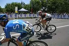 In 2012, Voigt was the oldest rider of the World Tour teams at 40 years of age when the season started.[46] That did not stop him from going into a long breakaway on the sixth stage of Paris–Nice. After every rider had been dropped but one, Voigt was beaten in a sprint by Luis León Sánchez of the Rabobank team.[47] In April, Voigt participated to the Tour of the Basque Country, where a peculiar incident occurred. Voigt signed in late for a stage start, then had a bit of a verbal match against an official who complained about his lateness. He was fined sign: Fr. or SFr. or FS 1,000 Swiss francs for what was described as "comportamiento incorrecto" (bad behavior) in a report.[48] He later had a good showing at the Tour of California, where he came in second of the fifth stage, an individual time trial contested in Bakersfield, 23 seconds behind David Zabriskie.[49] He was also part of breakaways and paced the bunch often. On the Tour de France, he finished in third position of the tenth stage. He was dropped on the slopes of the Col du Grand Colombier, but came back on the four escapees before competing in the final sprint.[50] In August, during a press conference prior to the Tour of Utah, he announced that he would continue racing through the 2013 season.[51] In the same month, Voigt took the fourth stage of the USA Pro Cycling Challenge finishing in Beaver Creek. He attacked his breakaway companions on Independence Pass, which was situated in the first third of the race, and then soloed on to victory with almost three minutes of an advantage over the chasers. He raced more than 100 kilometres (62 mi) alone, taking one of the most epic victory of his career.[52]