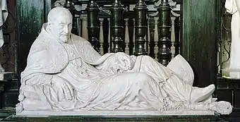Jerôme is generally regarded as a skilled sculptor, but a less original or innovative artist than his brother François. His artistic talent has been questioned based on assumptions surrounding the use for his own work of designs made by his brother, and in particular the designs for the bust (now in the Louvre Museum in Paris) and the tomb of Bishop Triest. Already in 1642 Bishop Antonius Triest had approached François Duquesnoy in relation to this bust and monument and had sent along a painting of himself to be used as the basis for the bust. François had declined the commission because of his upcoming move to France but is still said to have made a few terracotta models for putti for the monument.[5] There is no documentation whether or how much work François had done on the design and execution of the bust before he died in 1643. It is therefore difficult to determine how much (if any) of it is of his hand. The work was probably completed in 1643 or 1644 and is signed by Jerôme. The very high quality of the execution of the portrait has led to speculation that his brother had a major (or even sole) role in its design and even execution.[6][7] It is likely that the design of the tomb monument itself, which was made almost a decade later, was by Jerôme's own hand. The monument is placed in an architectural frame of black and white marble and depicts Mary and Christ looking down on the effigy of the Bishop reclining on a sarcophagus. The portrait of the Bishop in the monument is particularly fine although some have compared it unfavourably with the earlier bust of the Bishop.[4][7]