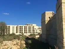 The Jerma Palace Hotel was built on a headland called il-Ħamrija, close to the 17th-century Saint Thomas Tower. The land originally belonged to Franciscan Conventuals and Ivan Burridge, who sold it to San Tumas Holdings. In 1976, San Tumas sold the plot to the Libyan Foreign Investment Company. The Jerma Palace Hotel was subsequently built, and it was opened in 1982. The hotel was managed by Corinthia Hotels International through a management agreement.[1] Libyan dictator Muammar Gaddafi had a presidential suite within the hotel.[2] A 1982 parliamentary resolution decreed that the area could only be developed for touristic purposes.[3]