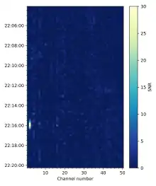The Wow! signal had a bandwidth of less than 10 kHz. It is considered narrowband emission in the sense that its fractional bandwidth was relatively small (~1%). However, the 10 kHz bandwidth is not small compared to the bandwidth of some astrophysical masers (~1 kHz) or to the frequency resolution of modern narrowband SETI searches (~1 Hz).[13] The Big Ear telescope was equipped with a receiver capable of measuring fifty 10 kHz-wide channels. The output from each channel was represented in the computer printout as a column of alphanumeric intensity values. The Wow! signal is essentially confined to one column.[12]