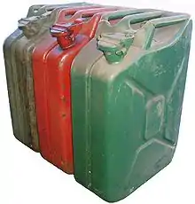 A jerrycan or jerrican (also styled jerry can or jerri can)[1] is a robust liquid container made from pressed steel (and more recently, high density polyethylene). It was designed in Germany in the 1930s for military use to hold 20 litres (4.4 imp gal; 5.3 US gal) of fuel, and saw widespread use by both Germany and the Allies during the Second World War.