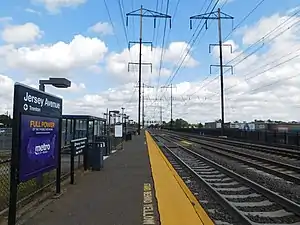 ![]() The Trenton-bound tracks of Jersey Avenue facing northward towards Newark. New York-bound trains do not use this track when stopping at Jersey Avenue. | |||||||||||||
