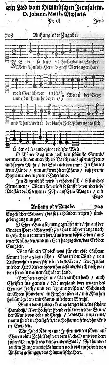 Johann Matthäus Meyfart was a Lutheran minister and professor of theology. He served as Rektor of the Casimirianum in Coburg when he wrote the text. The town was threatened by the Thirty Years' War, and Meyfart wanted to intensify spiritual life and morals of his students. He held regular academic sermons on Wednesdays, until 1625 in Latin, then in German. In the fall of 1626, he held four sermons titled Tuba Novissima (The last trumpet), dealing with "Tod, Gericht, ewige Seligkeit und Verdammnis" (Death, judgement, eternal bliss and condemnation), which were later printed.[1] The Jerusalem song closed his third sermon, titled Von der Frewde und Herrligkeit / welche alle Außerwehlte in dem ewigen Leben zu gewarten haben (Of the joy and glory which the selected ones may expect in eternal life).[1] The printed version contains comments and a final prayer, that were probably also spoken in the event.[1] The printed version also has comments for text changes in three stanzas when the hymn is sung by a congregation.[2]