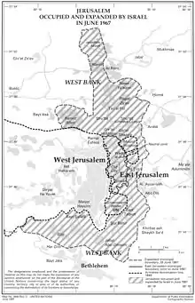 The Quds Governorate is divided into the sub-districts "Jerusalem J1" and "Jerusalem J2". Jerusalem J1 comprises the parts of the West Bank that were annexed by Israel in 1980 and included within the Israeli municipality Jerusalem. Jerusalem J1 is usually referred to as East Jerusalem. Jerusalem J2 comprises the parts of the Governorate that are not included in J1.[2]