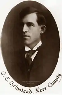 Within a year or so he purchased The Kerrville News and, inspired by the area's surrounding beauty, renamed it The Kerrville Mountain Sun.[7] In 1903 he was elected mayor of Kerrville and in 1906 their representative (House District 99) in the 30th state legislature. While serving in the Texas House of Representatives he was instrumental in pushing through legislation that led to the creation of the State Tubercular Sanatorium in Carlsbad. In July 1908 Grinstead failed to win Democratic support for a second term and was replaced by Sam O’Bryant who prevailed against his Republican opponent that November.[8][9] Grinstead also served on the Kerrville school board for many years.[2]