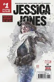 Jessica Jones is an American comic book series published by Marvel Comics, featuring Jessica Jones as its protagonist. Initially published as a tie-in to the 2015–2019 Marvel Cinematic Universe (MCU) Netflix television adaptation of the same name, the series was written by Brian Michael Bendis with art from Michael Gaydos. The series ran for 18 issues as part of both Marvel's Marvel NOW! and Marvel Legacy relaunches and lasted from December 2016 until May 2018, when Bendis left Marvel for DC Comics.[1] A digital exclusive relaunch with Kelly Thompson taking over from Bendis and Mattia de Luis taking over from Gaydos occurred in July 2018. [2] The series is the third to feature Jones as a protagonist following Alias (2001–4) and The Pulse (2004–6),[3] which both featured Bendis and Gaydos on the creative teams (Gaydos drew the last four issues of The Pulse).