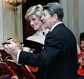 However, soon after the wedding, the Princess had the sapphire brooch converted into the clasp for a magnificent seven-strand pearl choker.[33] One of the earliest famous appearances was in 1985, when she wore the choker to dance with John Travolta at the White House.[14] A favourite piece of jewellery, the Princess wore this seven-strand pearl and sapphire choker for occasions at home and abroad. Another famous appearance of the sapphire choker was in 1994, when the Princess wore the piece (with the daring 'revenge' dress) on the night the Prince of Wales confessed to adultery with Camilla Parker Bowles.[34]