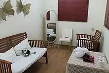 In Yemen, the Jewish practice was not for the groom and his bride to be secluded in a canopy (chuppah), as is widely practiced today in Jewish weddings, but rather in a bridal chamber that was, in effect, a highly decorated room in the house of the groom. This room was traditionally decorated with large hanging sheets of colored, patterned cloth, replete with wall cushions and short-length mattresses for reclining.[42] Their marriage is consummated when they have been left together alone in this room. The chuppah is described the same way in Sefer HaIttur (12th century),[43] and similarly in the Jerusalem Talmud.[44]