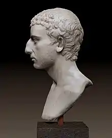 A Roman statue depicting a hawk-nosed figure in the collection of the Ny Carlsberg Glyptotek in Copenhagen, and acquired in 1891 from Princess Piombino, lacked an inscription in Latin identifying the subject but was presented by the museum in 1925 as Josephus, an identification defended by Robert Eisler. The grounds for Eisler's inference were simply that a notice in Eusebius stated that Josephus, the most famous Jew of his time, had a statue erected in his honour, and this bust, he thought, corresponded to a "crooked", "broken" "Jewish nose" as distinct from the classic aquiline Roman nose. The identification is still widely used online despite the fact that modern scholarship definitively rejects the claim.[17][18][19][20] Hebrews in ancient Near Eastern art, like other peoples, Canaanites for example, who lived to the west of the Assyrian empire, have straight protruding noses.[17][18]