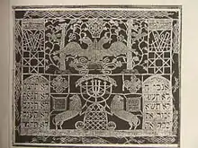 A Mizrah (hebr. The East) is a plaque hung on the east wall of private houses to show the direction of Jerusalem. A shivis’i (hebr. always) is similar to a mizrah, but it hangs on the east side of a synagogue. Its name is connected with a sentence from the Bible: 'Shivis'i adonai l'negdi tamid' ('I have set the LORD always before me').[23]: 4 Shivis’i in the form of paper cuts rather than some more durable material were only used in poor synagogues.