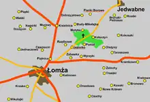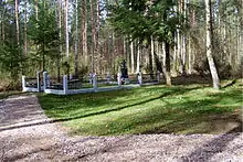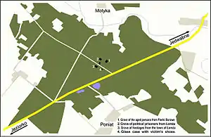 Woodland cemetery in Jeziorko village in the Northeastern part of Poland is located approximately 7 kilometers (4.3 mi) from the town of Łomża along Route 668. The remains of victims murdered by the Nazi troops rest in the cemetery which is among very few with almost completely documented history of events that happened during the Nazi occupation.
