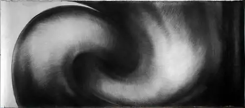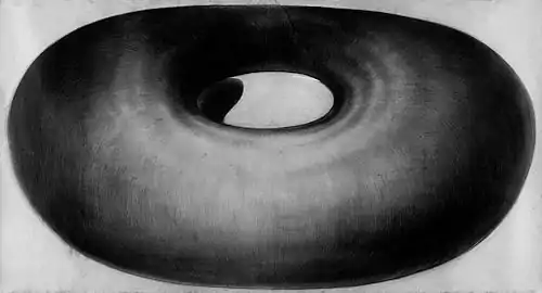 This shape also offers the possibility of mathematical transformation, during which the whole object can be turned inside out through eversion (like From nowhere to nowhere, 1990-7), to work in a 4D space and to decrease the central space through shortening of the axis, leading to final degeneration into a sphere. (It, charcoal on cardboard, 220 x 480 cm, 1989–92).
