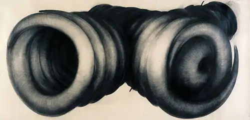 Giant objects from the beginning of the 1990s offer perfect spatial illusion of voluminous figures of organic shape (And out/aerial meditation, charcoal on cardboard, 220 x 500 cm, 1990–92, It, charcoal on cardboard 220 x 480 cm, 1989–92). The time range of their creation bears witness to how technically demanding these drawings are.