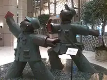 However, Jiang became famous with her iconic "Red Guard" series begun in 2003. These anonymous, open mouthed warriors who wear the Red Guard uniform, are cast in the ancient lost wax technique.[9] They carry either a red flag or The Little Red Book, and reflect both her personal experience as a young Red Guard during the Cultural Revolution, and her observations from abroad of China's emergence into a capitalistic machine.