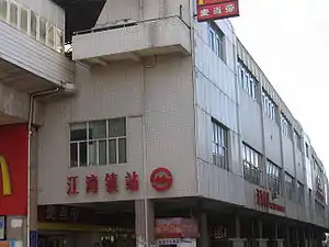Jiangwan Town (simplified Chinese: 江湾镇; traditional Chinese: 江灣鎮; pinyin: Jiāngwān Zhèn) is a station on Shanghai Metro Line 3.[1] It served as the northern terminus[2] of Line 3 from its opening on 26 December 2000[3][4] until 18 December 2006, when the northern extension to North Jiangyang Road opened.[5][3] Next to this station is a big supermarket with a lot of small clothes stores and some dinner locations. This station is used by people from a relatively large area, including many students living on Fudan University and Tongji University campuses. Both of these are less than 20 minutes' walk away.