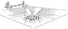 In the Tenrikyo religion, the Jiba (ぢば) is the axis mundi where adherents believe that God created humankind. The spot is located in the center of the main sanctuary at Tenrikyo Church Headquarters, located in Tenri, Nara, Japan. It is marked by a wooden pillar called the Kanrodai (かんろだい).