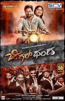 Jigarthandaa (transl. Cold-hearted) is a 2016 Indian Kannada-language action comedy film directed by Shiva Ganesh, written by Karthik Subbaraj and produced by Kichcha Creations and SRV Productions.[2][3] The film was a remake of 2014 Tamil film of same name which itself was inspired by the 2006 South Korean movie A Dirty Carnival.[4][5][6] It stars Rahul and Samyukta Hornad along with P. Ravi Shankar, Chikkanna, Dharma, K. Manju, Guruprasad, Sadhu Kokila and Veena Sundar in supporting roles. Arjun Janya composed film's score and soundtrack. It was released on 24 June 2016.[7][8]