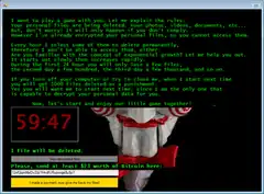Jigsaw was designed in April 2016 and released a week after creation.[1] It was designed to be spread through malicious attachments in spam emails.[3] Jigsaw is activated if a user downloads the malware program which will encrypt all user files and master boot record.[4] Following this, a popup featuring Billy the Puppet will appear with the ransom demand in the style of Saw's Jigsaw (one version including the "I want to play a game" line from the franchise) for Bitcoin in exchange for decrypting the files.[5] If the ransom is not paid within one hour, one file will be deleted.[5] Following this for each hour without a ransom payment, the amount of files deleted is exponentially increased each time from a few hundred to thousands of files until the computer is wiped after 72 hours.[2] Any attempt to reboot the computer or terminate the process will result in 1,000 files being deleted.[5] A further updated version also makes threats to dox the victim by revealing their personal information online.[6]
