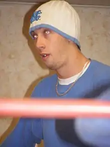 Jigsaw made his Chikara debut in late 2002, forming a rudo tag team named The Conundrum with Rorschach, while also occasionally teaming with Eddie Kingston and BlackJack Marciano as a member of The Toxic Trio.[4] On May 22, 2004, at Aniversario 3: Dodging the Sophomore Jinx The Toxic Trio faced Mike Quackenbush, Gran Akuma and Icarus in an Ultimate Jeopardy match. During the match, which The Toxic Trio lost, Kingston and Marciano turned on Jigsaw, effectively turning him into a tecnico.[8] In July 2004, Jigsaw reached the finals of Chikara's Young Lions Cup tournament, but was defeated by Larry Sweeney after outside interference from Rorschach, who then joined Sweeney's Sweet 'n' Sour International stable.[4] On October 30 Jigsaw led an eight man team to face Sweet 'n' Sour International in the annual torneo cibernetico match. Jigsaw won the match by pinning Sweeney, after one of Sweeney's stable mates, named Spyrazul, turned on him and then unmasked himself to reveal Mike Quackenbush.[4][5] At the following show Fear of Music on November 19, 2004, Jigsaw defeated Sweeney to win the Young Lions Cup.[4]