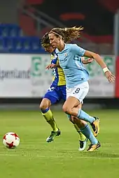 After leaving Everton, Scott signed a two-year deal with Manchester City.[22] This move proved a success, as she played her part in securing the Continental Cup Trophy for Manchester City in 2014.[23]