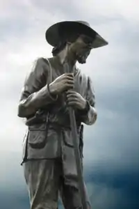 Baker traveled with the Bartleson–Bidwell Party headed for California in May 1841. It was the first wagon train to travel overland on the Oregon Trail. Baker traveled from the Green River, to Bridger's camp at the Henry's Fork, arriving in early August. Bridger, who was worried about his overdue associate Henry Fraeb, sent Baker and others to search for the lost party[1] and to warn them of increased hostility among the Plains Indians. Fraeb was found at the base of Squaw Mountain on the banks of the Little Snake River and Battle Creek, near what is now the border between Wyoming and Colorado.[7][9][lower-alpha 2] Baker hunted near Fraeb's camp on August 21, 1841. Twenty three trappers were attacked by 500 Arapaho, Cheyenne, and Sioux.[3][10] After Fraeb was killed, Baker took charge of the battle that extended over two[1] to six days.[3] The trappers hid behind stumps, dug pits, and created a defensive barrier of dead horses and logs. The battle ended after a Native American chief's horse was shot and fell over.[10] Four trappers were killed. Most of the trappers' horses were killed, with more than 100 horses dead from both sides.[1] Legend has it that 35[9] or 100 Native Americans were killed, but those numbers may be exaggerated. Baker and other survivors returned to Bridger's camp on the Green River on August 27. The mountain was later renamed Battle Mountain.[1]