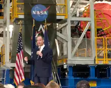 In March 2019, Mike Pence pushed NASA to land humans on the Moon in 2024 instead of the initially planned 2028.[56] Bridenstine stated that for it to happen, the Space Launch System would need to be accelerated, along with various other aspects such as the LOP-G, an orbiting space station around the Moon. Bridenstine also considered commercial Heavy-Lift rockets such as the Delta IV Heavy or Falcon Heavy. The idea was scrapped due to the logistical issue of docking an Orion and a European Service Module and the aerodynamics of using a Falcon Heavy.[57]