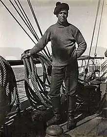 In 1911 Lieutenant Harry Pennell of the Royal Navy visited Peel Forest station. He was assigned to the research vessel Terra Nova. After having transported the Terra Nova Expedition (1910–1913 ) under the command of British polar explorer Robert Falcon Scott to Cape Evans on the Ross Island in the Antarctic, the ship was wintering over in New Zealand prior to returning with supplies for the expedition. Pennell mentioned that he wanted someone to take charge of the seven Himalayan mules donated by the Indian government which they would be carrying south to the expedition.[10][11] The mules had arrived in September 1911 and were quarantined on Quail Island which is located 3 km from the port of Lyttelton. Pennell could offer no pay, but the adventure was enough to attract Dennistoun and he signed up. While some clothing was provided, Dennistoun had to supply much of his own. As well as caring for the mules Dennistoun was also responsible for 14 Siberian dogs being transported south.[12]