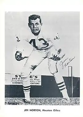 James Charles Norton (October 20, 1938 – June 12, 2007) was an American professional football player who was a strong safety and punter for the Houston Oilers of the American Football League (AFL). An original member of the Oilers franchise, he played in their first nine seasons from 1960 to 1968. Norton was an AFL All-Star for three seasons and holds the league's record for career interceptions. His jersey No. 43 was the first of eight retired by the Oilers/Titans franchise.[1]