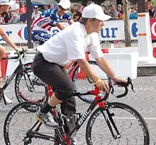 In 2007 he began the BMC Racing Team, which first competed on the international professional cycling circuit in 2010.[2] A major signing for the team was Australian rider Cadel Evans, who had been among the general classification favorites in several previous editions of the Tour. He showed promise in the 2010 Giro d'Italia, where he held the pink jersey for a stage, won a stage,[10] won the overall Points Classification and placed 5th overall, but his performance in the 2010 Tour was disappointing as he finished about an hour behind the winner. In the 2011 Tour de France Evans was in top form. Going into the final ITT on stage 20 he was +0:04 behind Fränk Schleck and just under a minute behind Andy Schleck. Evans finished 2nd on the stage but easily overcame the deficits to the Schleck brothers and became Tour champion.