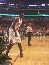 On July 9, 2015, Butler re-signed with the Bulls to a five-year, $95 million contract. The deal included a player option for the fifth year.[24][25] On December 9, he scored a then career-high 36 points in a loss to the Boston Celtics.[26] He topped that mark with 43 points on December 18 in a 147–144 quadruple overtime loss to the Detroit Pistons.[27] On January 3, Butler broke Michael Jordan's team record for points in a half, scoring 40 of his 42 after the break to lead the Bulls to a 115–113 win over the Toronto Raptors.[28] Two days later, he recorded 32 points and a then season-high 10 assists in a 117–106 win over the Milwaukee Bucks.[29] On January 14, he scored a career-high 53 points in a 115–111 overtime win over the Philadelphia 76ers. Butler also had 10 rebounds and six assists while making 15-of-30 field goals and 21-of-25 free throws to help the Bulls snap a three-game losing streak. He became the first Bulls player to score 50 points since Jamal Crawford in 2004.[30] On February 5, Butler suffered a left knee strain in a game against the Denver Nuggets[31] and missed nearly four weeks.[32] He was voted to play in the 2016 NBA All-Star Game, but the injury forced him to drop out, and he was subsequently replaced in the East team by teammate Pau Gasol.[33] Butler missed 11 games with the knee injury, returning to action for the Bulls on March 5 against the Houston Rockets. In 34 minutes of action, he recorded 24 points, 11 rebounds, 6 assists and 1 steal in a 108–100 win, helping the Bulls snap a four-game losing streak.[34] However, he returned to the sidelines on March 7 for the team's game against the Milwaukee Bucks due to back soreness and swelling in his left knee.[35] After a three-game absence, he returned to action on March 14 against the Toronto Raptors.[36] On April 2, he recorded his first career triple-double with 28 points and career highs of 17 rebounds and 12 assists in a 94–90 loss to the Detroit Pistons.[37] In the Bulls' season finale on April 13, Butler recorded his second career triple-double with 10 points, 12 rebounds and 10 assists in a 115–105 win over the Philadelphia 76ers.[38]