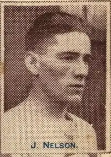Nelson was born in Greenock, Scotland, the sixth son of Alexander Nelson and his wife Jeanie.[2][3] The family moved to Northern Ireland when Nelson was seven where his father was employed as a ship builder.[4][5] He started his football career there with junior sides St Paul's and Glenarm, initially playing as a forward.[6][7] At senior level, he joined Irish Intermediate League side Crusaders in 1919 where he was described as a "fullback with great promise".[8][9] His spell with the team was disrupted by a broken leg during his second season,[9] however he was still chosen to represent an Irish League XI on several occasions and captained the side against their English counterparts.[7][10] He was spotted by Fred Stewart, manager of Welsh side Cardiff City, who paid £500 to complete a transfer to Cardiff. Such was Nelson's success at Cardiff that the Welsh side sent a message to Crusaders asking "Have you any more players like Jimmy?". This correspondence ultimately led to Tom Sloan and Tom Watson also moving to Cardiff in the following years.[11]