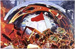 Jin Meyerson's paintings are schizophrenic semi-abstractions based on throwaway images from magazines and other random pieces of visual culture. Although the use of media imagery is common ground for many contemporary painters, Meyerson's take on the topic is more manic than most; while artists such as Ulrich Lamsfuss, Johannes Kahrs and Gerhard Richter are more concerned with the faithful – almost obsessive – copy, Meyerson's takes his source material as a sketch which he can distort, tear apart, rearrange and fill with psychedelic colour. Meyerson does not completely destroy or obscure the images, but by the end of his more-or-less unplanned interventions the painting's origin is severely disguised. Most of Mayerson's work displays his fascination with moving images, but for him a moment of speed or activity caught on film is not enough; the addition of swirling bands of striking colour add to the sense of motion to create something that functions beyond the limits of painting and photography, making the viewer ‘feel’ the energy of the image and invoke the spectacle of real life action when the moment itself is long over.