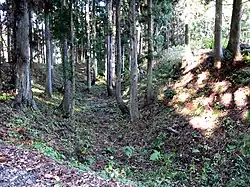 Jingamine Castle is located on a fan-shaped hill in the northwestern end of the Aizu Basin, with the Aga River to the north, and the main route to Echigo Province to the south, with an elevation of 192 meters. It is protected by a steep cliff on its eastern side. The castle site is roughly pentagonal, approximately 110 meters east–west and 175 meters north–south, surrounded on three sides by a double moat ranging from 30 to 60 meters in width and 15 meters in depth. Inside this enclosure was a large building with a pillar foundation, and numerous artifacts such as Chinese white porcelain, Korean celadons, bronze mirrors and weights have been found in large numbers. To the east of the site of the central structure, porcelain plates, carbonized wooden bowls and balls of rice, plus large quantities of carbonized rice and beans were discovered.[2]