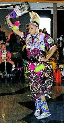 Jingle dress is a First Nations and Native American women's pow wow regalia and dance. North Central College associate professor Matthew Krystal notes, in his book, Indigenous Dance and Dancing Indian: Contested Representation in the Global Era, that "Whereas men's styles offer Grass Dance as a healing themed dance, women may select Jingle Dress Dance."[1] The regalia worn for the dance is a jingle dress, which includes ornamentation with multiple rows of metal, such as cones, that create a jingling sound as the dancer moves.