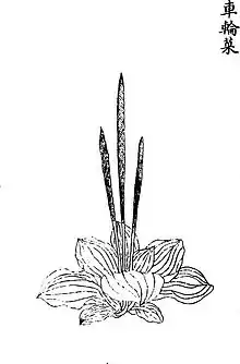 [Shuicigu] The common name for this is scissors herb [jiandaocao] or else [jiandacao] (hung-up arrows herb). It grows in water, the item is grooved on one side (wā [窊]) and squarish on the other, with stringy fibres. The leaves are three-horned, resembling indeed a pair of scissors. From amidst the leaf-stalks rise up scapes which fork and bear three-petalled white flowers with yellow centres. Each of these gives a blue-green fruit follicle ([gūtū 蓇葖]) like that of the [qīngchǔtáo 青楮桃 "paper mulberry"] but rather smaller. The (tuberous) root is of the same kind as that of the onion ([cōng 葱]) but coarser and larger and of a sweet taste. In case of hunger collect the young and tender shoots near the (tuberous) roots and scald them, then add oil and salt, and eat.[19]