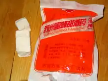 Jiuqu, also known as just qū (in Mainland Chinese Mandarin) or qú (in Taiwanese Mandarin),[1] is a type of East Asian dried fermentation starter used in the production of traditional Chinese alcoholic beverages.[2] The word jiǔqū specifically refers to a type of qū (traditional Chinese: 麴; simplified Chinese: 曲/麹) used to manufacture alcoholic products (酒; jiǔ), such as huangjiu (cereal wines), baijiu (distilled spirits) and jiuniang (alcoholic rice porridge/pudding).