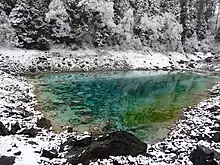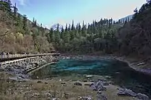• Five-Color Pond (五彩池, Wǔcǎi Chí) is one of the smallest bodies of water in Jiuzhaigou lakes. Despite its very modest dimensions and depth, it has a richly colored underwater landscape with some of the brightest and clearest waters in the area. According to legend, the pond was where Goddess Semo washed her hair and God Dage came daily to bring her water.