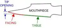 The facing (or lay) is a curved section that leaves the flat table and continues to the tip of the mouthpiece. The length of a facing—defined as the distance from the tip of the mouthpiece to the point where the reed and mouthpiece meet—can vary.[2] Different facing lengths have different response properties.