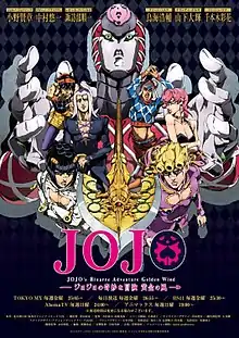 JoJo's Bizarre Adventure: Golden Wind (Japanese: ジョジョの奇妙な冒険 黄金の風, Hepburn: JoJo no Kimyō na Bōken Ōgon no Kaze) is the fourth season of the JoJo's Bizarre Adventure anime television series by David Production, adapting Golden Wind, the fifth part of Hirohiko Araki's JoJo's Bizarre Adventure manga. Set in Italy during 2001, two years after the events of Diamond is Unbreakable, the series follows the adventures of Giorno Giovanna, the son of Dio Brando (from Phantom Blood and Stardust Crusaders) albeit conceived with Jonathan Joestar's body, who joins the criminal organization Passione in the hopes of becoming a gangster (or "Gang-Star") and taking control of the organization in the name of reform.
