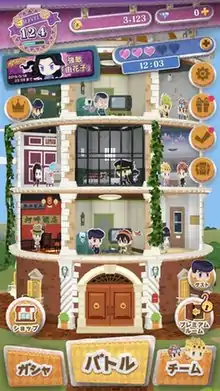 The second main aspect of gameplay was the 'JoJo Mansion', a building with eight rooms capable of holding up to two units each. As the player leveled up more storeys would become available up to a maximum of three storeys for a total of 24 rooms. By using furniture tickets unlocked from battles players could purchase furniture to decorate each room. Players could assign a unit to each room (two if the first unit was Skill Level 5). While in the room units could be interacted with in a number of different ways.[9] Players could give their units gifts which would increase a friendship meter. Gifts came in three different levels each giving more 'friendship points' than the last. Each unit also had a preferred gift which would greatly increase their friendship meter. On occasion, units could 'visit' another room, this would earn the player a small number of experience points.