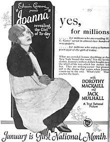 Joanna is a 1925 American silent romantic comedy film produced and directed by Edwin Carewe and distributed by First National Pictures. The film was based on the short story "Joanna, of the Skirts Too Short and the Lips Too Red and the Tongue Too Pert" by Henry Leyford Gates.[1] The film starred Dorothy Mackaill and Jack Mulhall, and it also marked the first motion picture appearance of Mexican actress Dolores del Río.