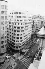 In terms of urban planning the Cárcer term is criticized as improvisation, especially that the first long-term plan was approved after he had left.[180] Setting new straight major throughways was already in the 1940s lambasted as childish and anti-social, as it led to destruction of historical boroughs and demolition of existing houses with no replacement provided.[181] Management of municipal finances, considered totally chaotic, attracts even heavier criticism. Though during the 1940 audience with Franco Cárcer ensured hefty credit line,[182] his concept of enhancing city income relied mostly on "politica annexionista".[183] For some time the city used the 1935 budget for its planning, the result having been a major deficit.[184]