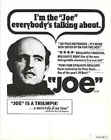 Quentin Tarantino wrote in his book Cinema Speculation that Joe is "a kettle-black comedy about class in America, bordering on satire", and said that although contemporary viewers may find it controversial to call the film a black comedy, he recalled that the audience he saw the film with in 1970, in a double feature with Carl Reiner's Where's Poppa?, watched the first section of Joe in silence, only to begin laughing "once Dennis Patrick enters the tavern, and Peter Boyle's Joe enters the movie,", having gone from "repulsed repose to outright hilarity". Tarantino says that "Boyle's comedic performance alleviates the picture's one-note ugliness".[9] Variety wrote, "It sounds like heavy stuff, but scripter Norman Wexler has fleshed his serious skeleton with both melodrama plotting that sustains interest and the grittiest, most obscene dialog yet to boom from the silver screen. It works."[10] Howard Thompson of The New York Times wrote, "The sad, disappointing thing about 'Joe' is that a devastating, original idea cynically slopes into a melodramatic, surface fiasco."[11] Gene Siskel of the Chicago Tribune gave the film three-and-a-half stars out of four and called it "a landmark film because of the issues and social norms it justifies. It is a dramatic, if not always sophisticated, documentary of a growing portion of the national mentality."[12] Charles Champlin of the Los Angeles Times called it "an immensely sophisticated piece of film-making," adding, "The plot is laced with implausibilities and the movie full of scenes which are heavily contrived but which play well because they are swept along by the plausibility of Joe himself."[13] Gary Arnold of The Washington Post called it "a fascinating, tendentious picture—a topical murder melodrama and social parable, done in that vivid, loaded, paranoid style which seems to have become a tradition in record time but which remains exciting to watch, even if you question the drift and outcome of the parable."[14] Penelope Gilliatt of The New Yorker wrote, "In the end, 'Joe' sells us short. It shows us clashing archetypes, promises us something of large mind, and then stammers platitudes that lead theatrically every which way."[15]