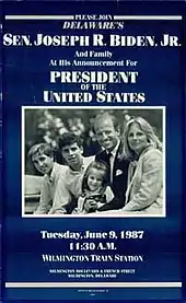 At the age of 44, Biden became one of the official candidates for Democratic nomination, formally declaring his candidacy at the Wilmington train station on June 9, 1987.[13]